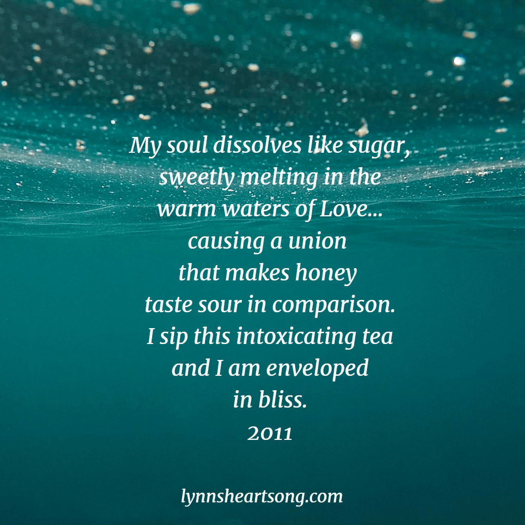 Nov20 Enveloped in Bliss Posted on November 20, 2011 by Lynn Kennedy Standard My soul dissolves like sugar sweetly melting in the warm water of Love… causing a union that makes honey taste sour in comparison. I sip this intoxicating tea and I am enveloped in bliss. August 2011 Share this: Click to share on X (Opens in new window) X Click to share on Facebook (Opens in new window) Facebook Like Loading...