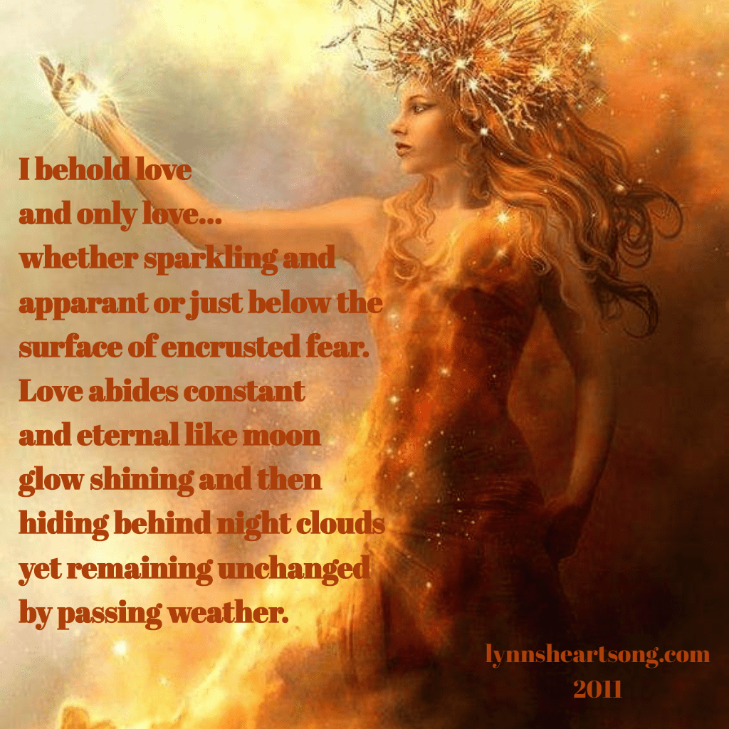 Nov30 Constant and Eternal Posted on November 30, 2011 by Lynn Kennedy Standard I behold Loveand only Love…whether sparkling and apparentor just below the surface of encrusted fear.Love abides constant and eternal,like moon glowshining and then hidingbehind night cloudsyet remaining unchangedby passing weather. 2011 Share this: Click to share on X (Opens in new window) X Click to share on Facebook (Opens in new window) Facebook Like Loading...