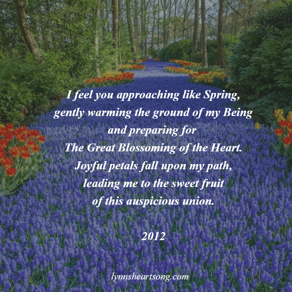May5 Sweet Fruit Posted on May 5, 2012 by Lynn Kennedy Standard I feel you approaching like Spring,gently warming the ground of my Beingand preparing for The Great Blossoming of The Heart. Joyful petals fall upon my pathleading me to the sweet fruit of thisauspicious union. March 2012 Share this: Click to share on X (Opens in new window) X Click to share on Facebook (Opens in new window) Facebook Like Loading...