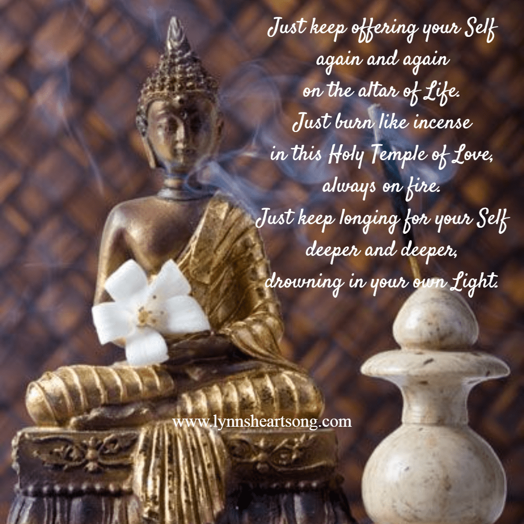 Oct31 Keep Offering Posted on October 31, 2012 by Lynn Kennedy Standard Just keep offering your Self again and again on the altar of Life. Just burn like incense in this Holy Temple of Love… always on fire. Just keep longing for your Self deeper and deeper, drowning in your own Light. June 2008 Share this: Click to share on X (Opens in new window) X Click to share on Facebook (Opens in new window) Facebook Like Loading...